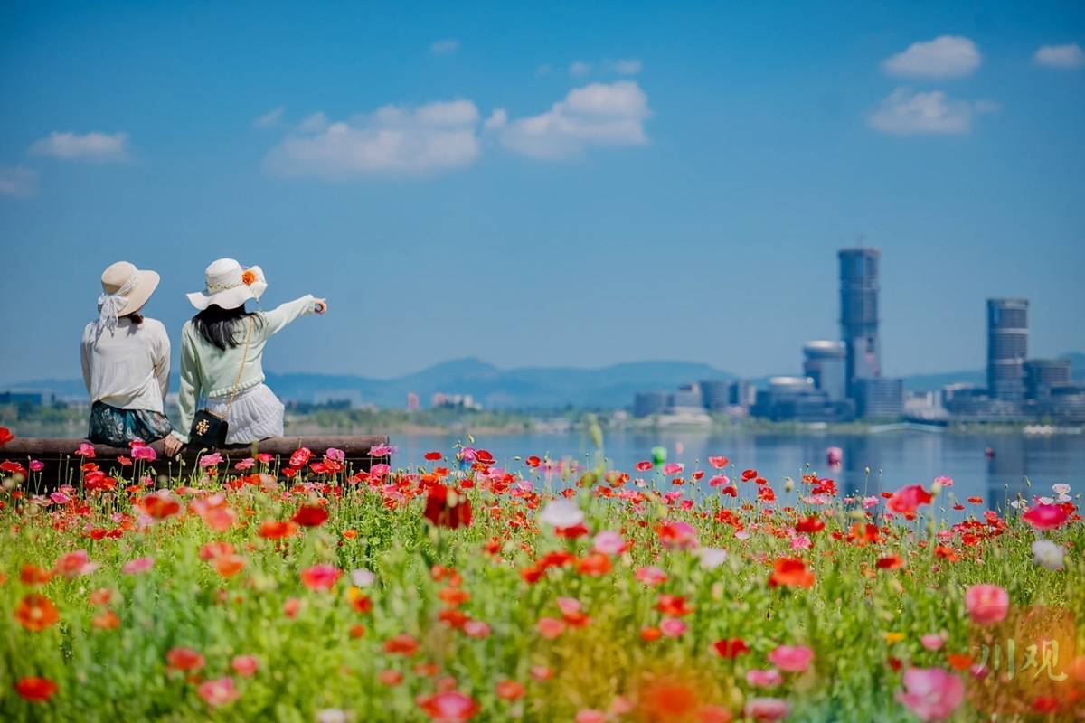 4月17日,宜宾市翠屏区安阜街道岷江花海的各类花卉盛开,吸引众多市民、游客前来打卡留影。C视觉摄影师 王宇 摄