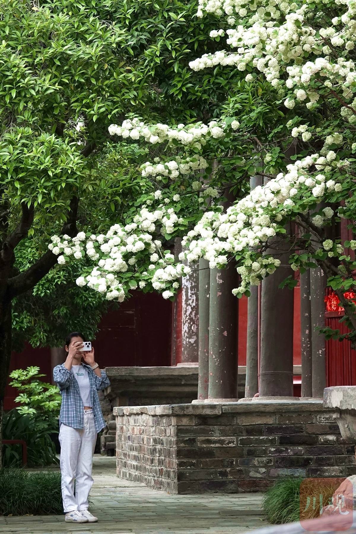4月20日,绵阳市平武县报恩寺内的绣球花进入盛花期,一簇簇白色花团掩映于明代古建筑群中。C视觉摄影师 胡宇 摄