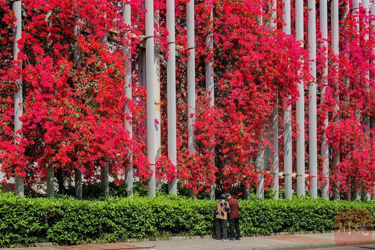 4月16日,成都石室天府中学(交子校区)围墙处成片三角梅紫红花枝如绚烂花瀑倾泻而下,成为蓉城春日靓丽风景线。C视觉摄影师 周巧旻 摄